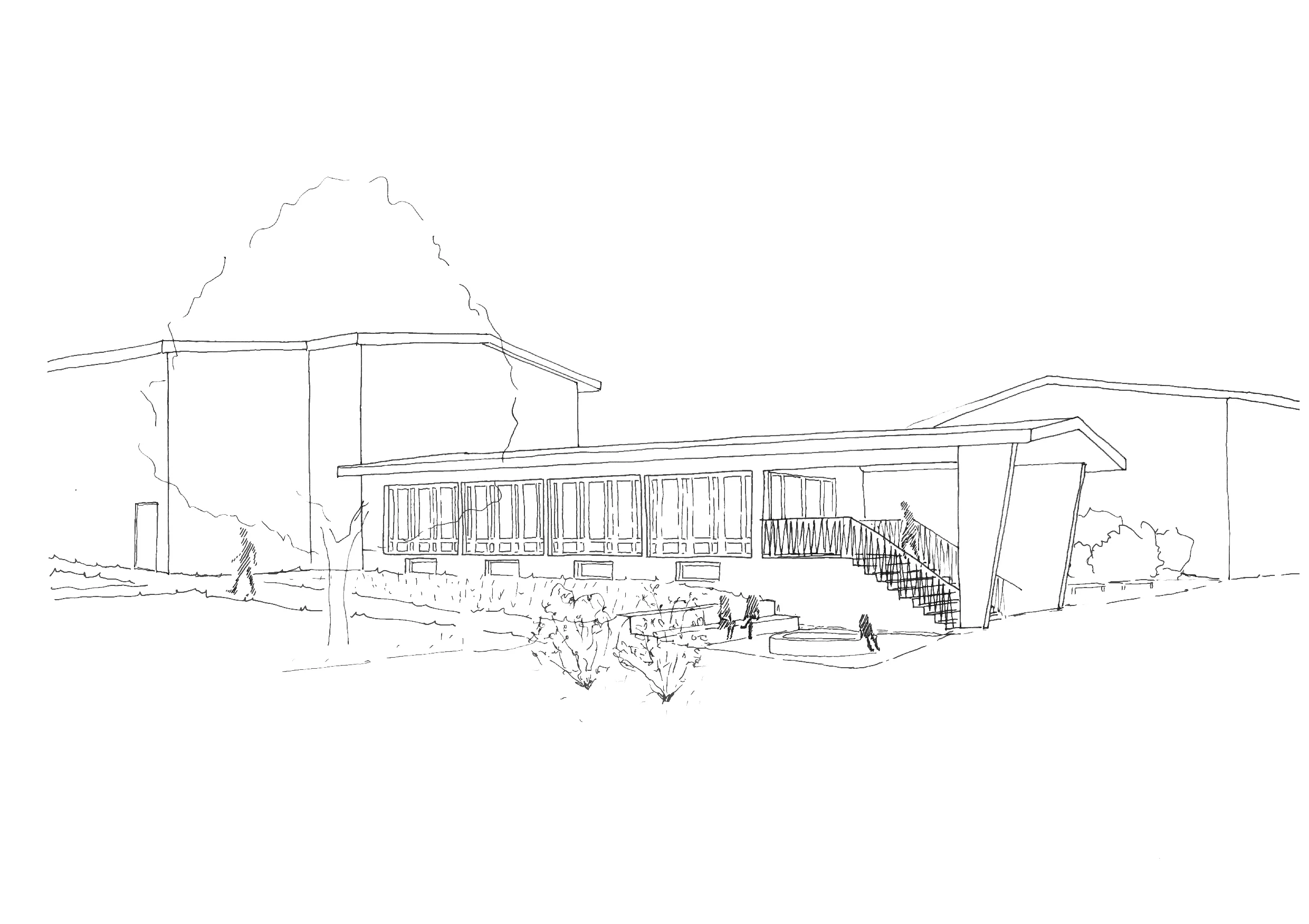 Die Eingriffe in den Bestand werden minimal gehalten. So wird die bestehende Freitreppe beim Haupteingang seitlich geöffnet und mit einem neuen Vorplatz als Adresse gestärkt. Der Treppenkern beim Haupttrakt wird im Bereich der geschlossenen Fassade um eine Achse für einen Lifteinbau erweitert. Zudem verbindet eine neue, zweigeschossige Pausenhalle die beiden Unterrichtstrakte. Durch die transparente Gestaltung und das Flachdach erscheint die Halle weiterhin als untergeordnetes Gelenk innerhalb der Schulanlage.