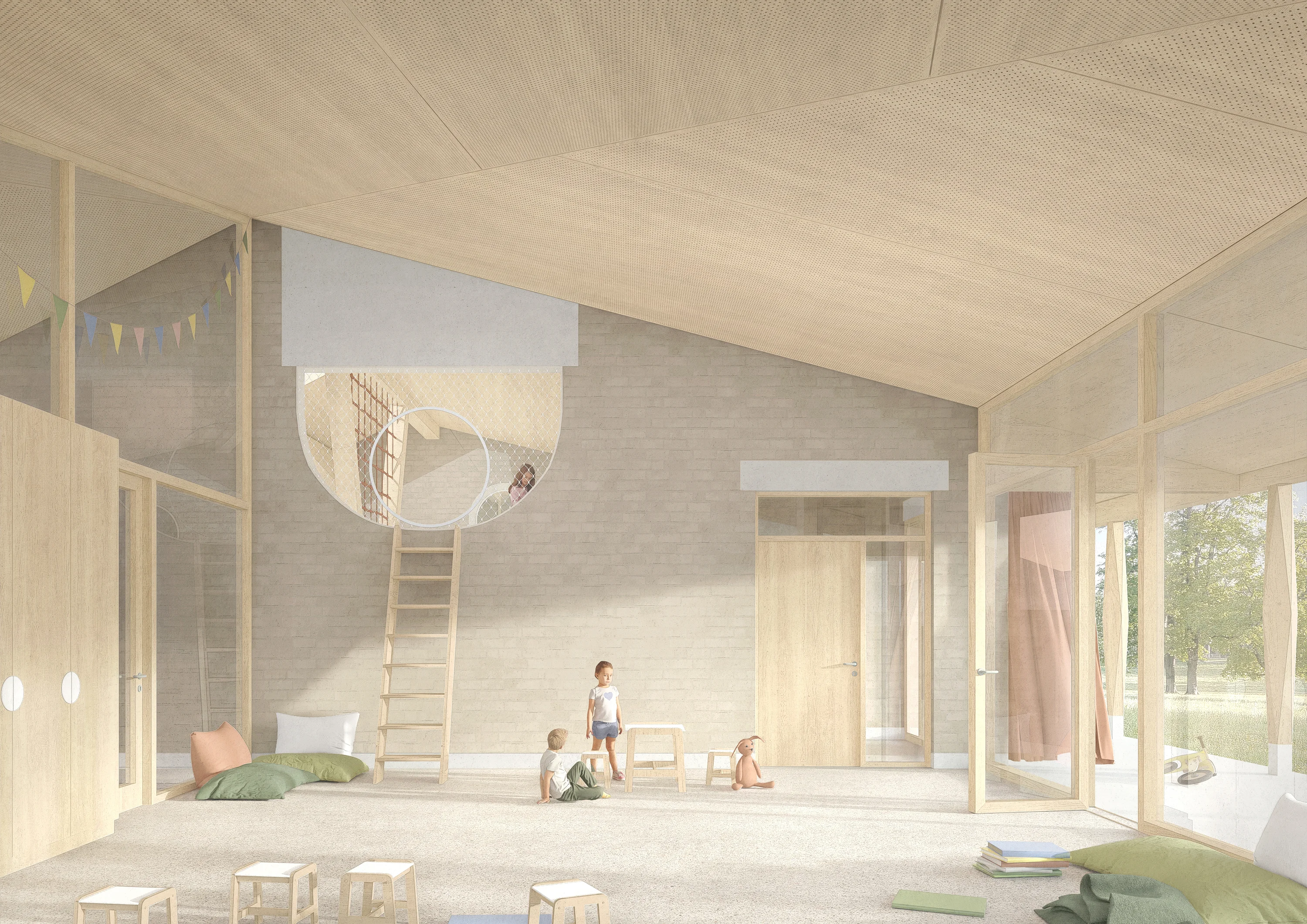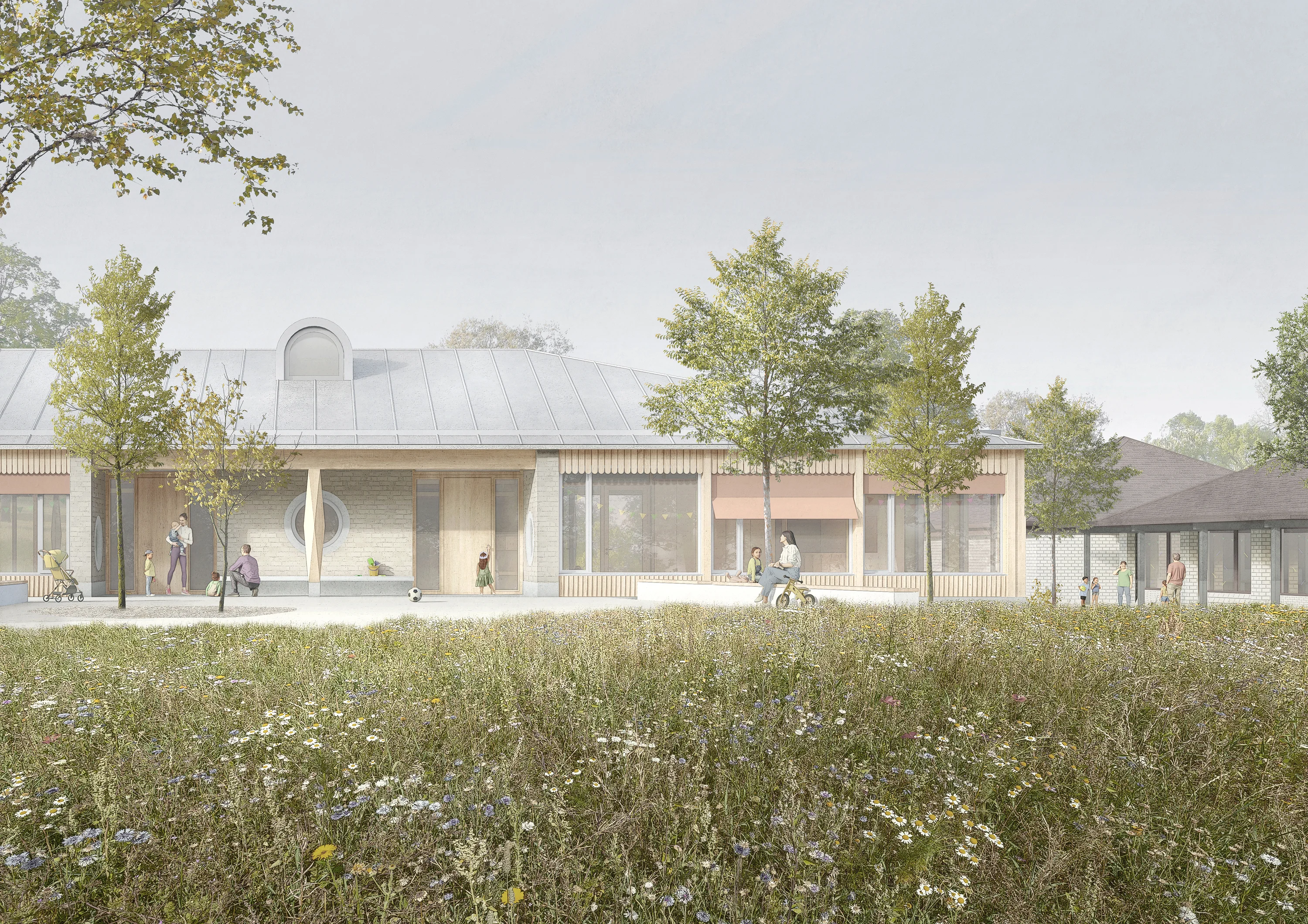 Der neue Erweiterungsbau mit den Räumlichkeiten für den Kindergarten und die Spielgruppe wird in unmittelbarer Nachbarschaft zum bestehenden Kindergarten Baschi und dem südseitig angrenzenden Bauernhaus mit Kindertagesstätte platziert. So entsteht ein neuer Ort für die Kleinsten, der zum gemeinsamen Spielen einlädt und Synergien fördert. Der eingeschossige Neubau mit charakteristischem Walmdach schliesst stirnseitig mit seiner Massstäblichkeit und Architektursprache an das Pfarreiheim und den Kindergarten Baschi an. Der langgestreckte Baukörper schafft einen einladenden Vorbereich zum Schulweg mit klarer Adresse und leitet mit seiner Setzung zur ostseitigen Schulanlage über. Südseitig wird ein grosszügiger und optimal orientierter Freiraum aufgespannt – als gemeinsame Mitte, von der auch der angrenzende Kindergarten und die Kita profitieren können.
